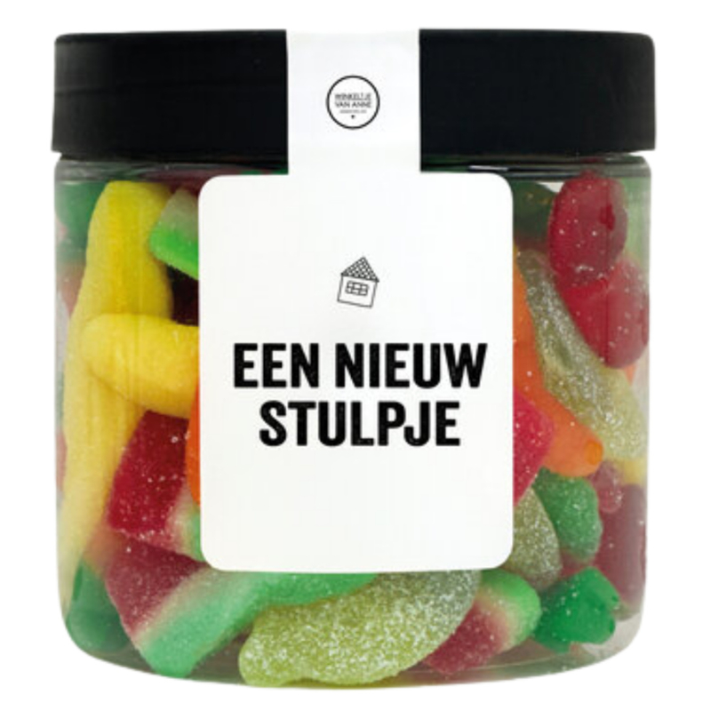Een fris en vrolijk snoeppotje gevuld met een fruity mix. Ideaal om iemand te feliciteren met een nieuw huis en meteen iets lekkers te geven voor het eerste proost moment.