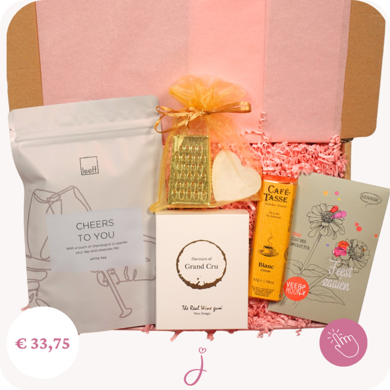 Verjaardagscadeau Cheers to you - Brievenbus cadeauVerras jouw vriendin, zus, moeder of collega met dit feestelijke verjaardagscadeau per post. Een vrolijk brievenbus cadeau gevuld met lekkers, en een liefdevol gebaar.