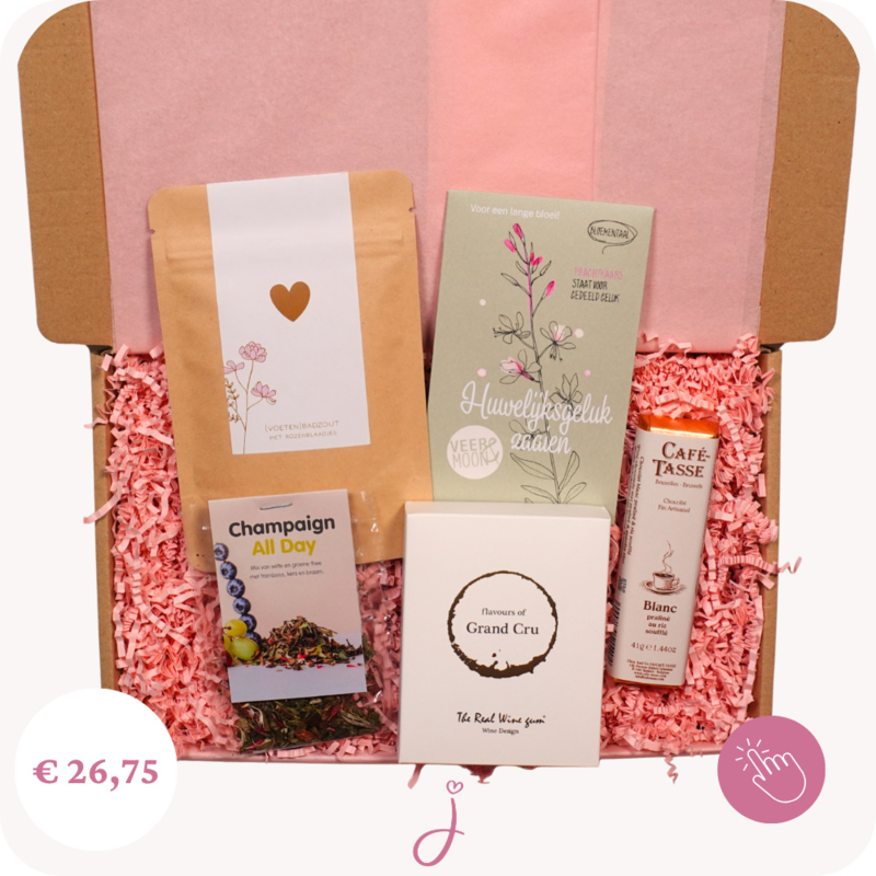 Huwelijkscadeau "Huwelijksgeluk"- Brievenbus cadeauHuwelijkscadeau Huwelijksgeluk – Brievenbus cadeauEen betekenisvol huwelijkscadeau dat door de brievenbus past. Ideaal om newly weds te verrassen met een klein maar liefdevol pakketje vol zachte kleuren, zoetigheid en iets dat…